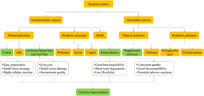 Surgical sutures as the most widely used and high-value implanted materials are of vital importance in wound closure and healing. Among them, cellulose-based sutures with multifunctionality have been developed in recent decades, and are very promising to replace the fossil-based synthetic sutures. Therefore, this paper aims at covering the history and recent advances of cellulose-based suture, mainly including the materials used (e.g., natural cellulose, nanocellulose, and regenerated cellulose), fabrication methods and mechanism of wet spinning and the recently developed interfacial polyelectrolyte complexation spinning, as well as suture application performance (such as mechanical properties, cytocompatibility, biodegradability, absorbable properties, and antibacterial properties). More importantly, it summarizes all cellulose-based sutures, and then delves deep into the challenges and future outlook. Thus, this review provides an important reference for the development of high-end cellulose-based medical sutures.