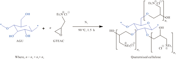 Microfibrillated cellulose (MFC) was functionalised using a reactive ionic liquid monomer, i.e., glycidyltriethylammonium chloride (GTEAC), via chain-growth polymerisation, resulting in a novel cationic polyelectrolyte-grafted quaternised MFC (QMFC). The degree of quaternisation and maximum ion exchange capacity of the resulting QMFC were 2.13 mmol/g (i.e., 132 mg/g) and 1.51 mmol/g (i.e., 94 mg/g), respectively. Small-angle X-ray scattering (SAXS) and wide-angle X-ray scattering (WAXS) experiments confirmed the retention of monoclinic crystalline structure for cellulose I with the corresponding decrease in the degree of crystallinity from 85% to 56% and the increase in the spacing between cellulose crystallites by 35%. The presence of the amorphous and grafted polymers was confirmed by microscopy, thermal analysis, and water sorption experiments. QMFC filter cartridges were prepared and tested under dynamic flow conditions with a pressure of 0.2 MPa (retention time of 0.5 min). These cationic polyelectrolytes enhanced multi-site ion exchange interactions as evidenced by the Freundlich sorption isotherm. The QMFC filter cartridges demonstrated high anion removal efficiency values of 83.2%, 98.1%, and 94.9% for NO3-, SO42-, and PO43-, respectively. This system achieved a process mass efficiency of 2.79, an E-factor of 1.97, and an energy efficiency score of 66.3, which conforms to the green chemistry principles and demonstrates high potential for sustainable water purification.